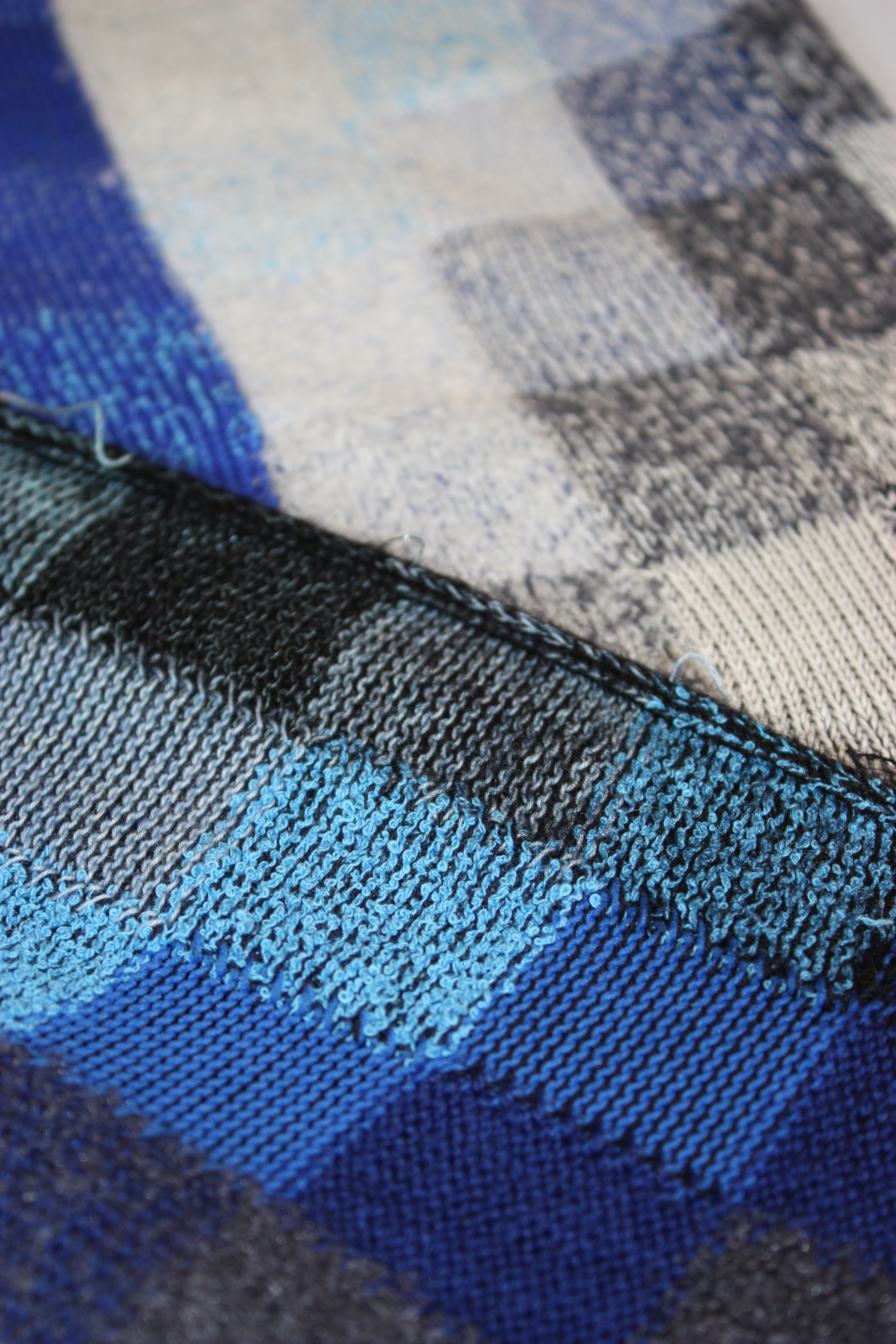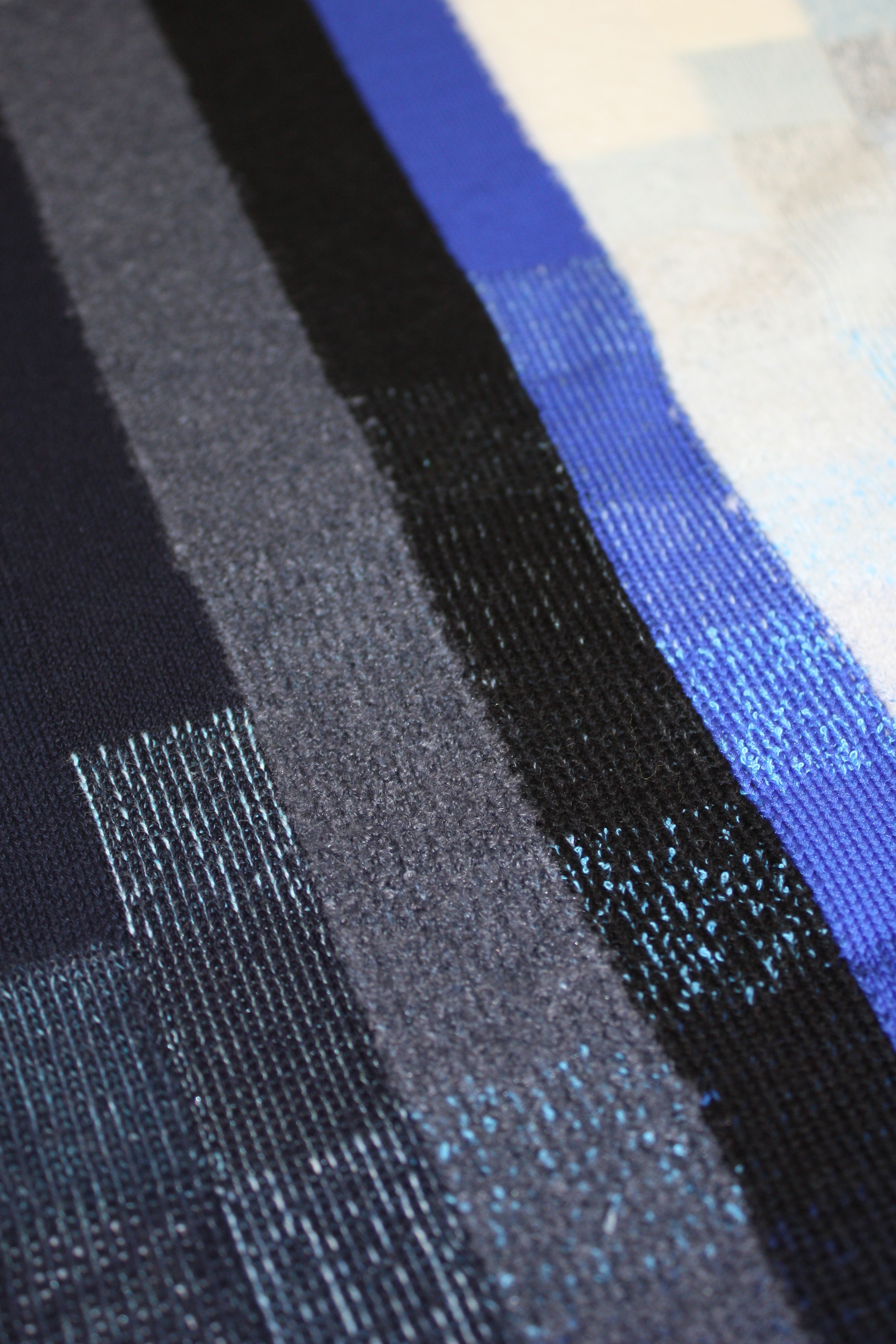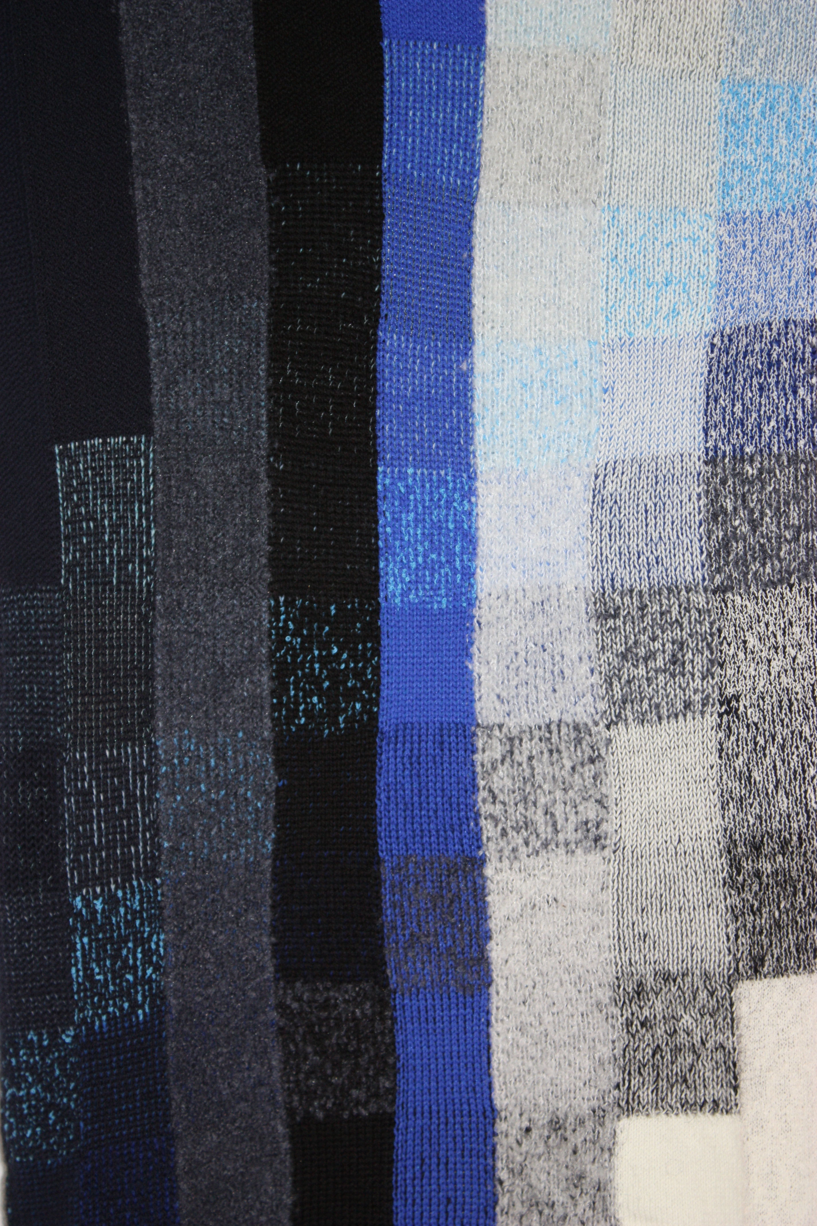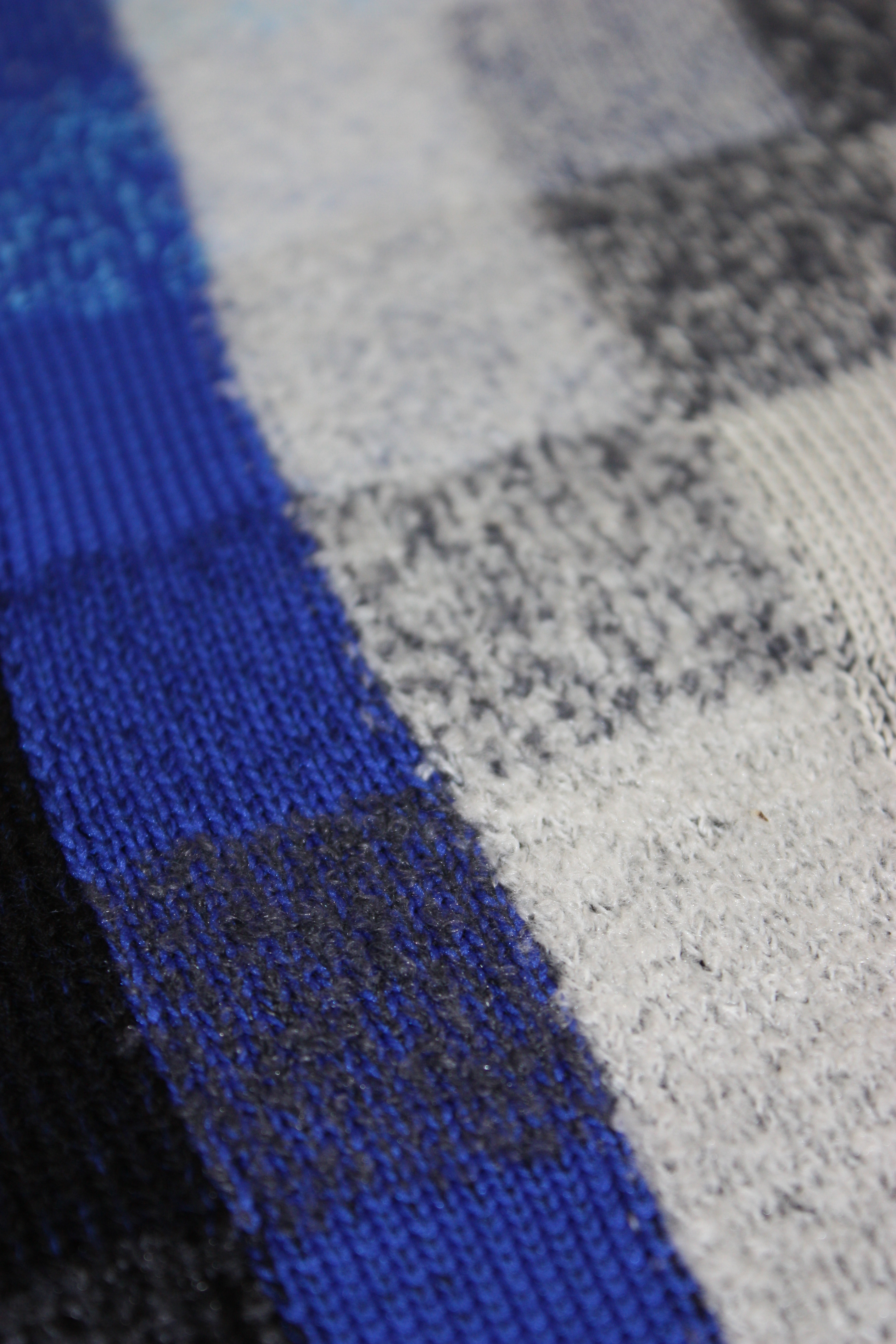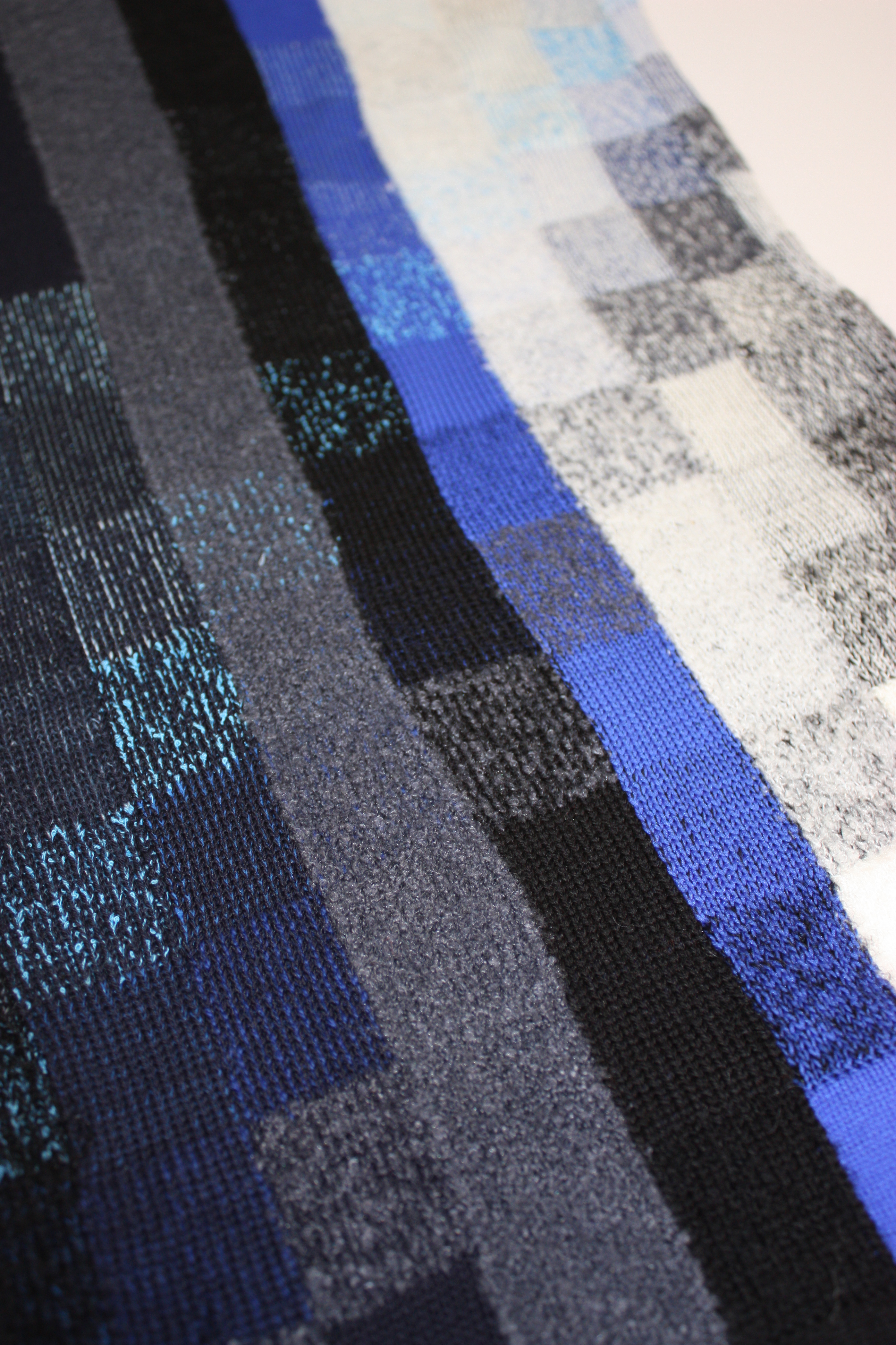 Striped Intarsia pattern with 9 integrated plated effect yarns. Knitted with 23 yarn carriers.