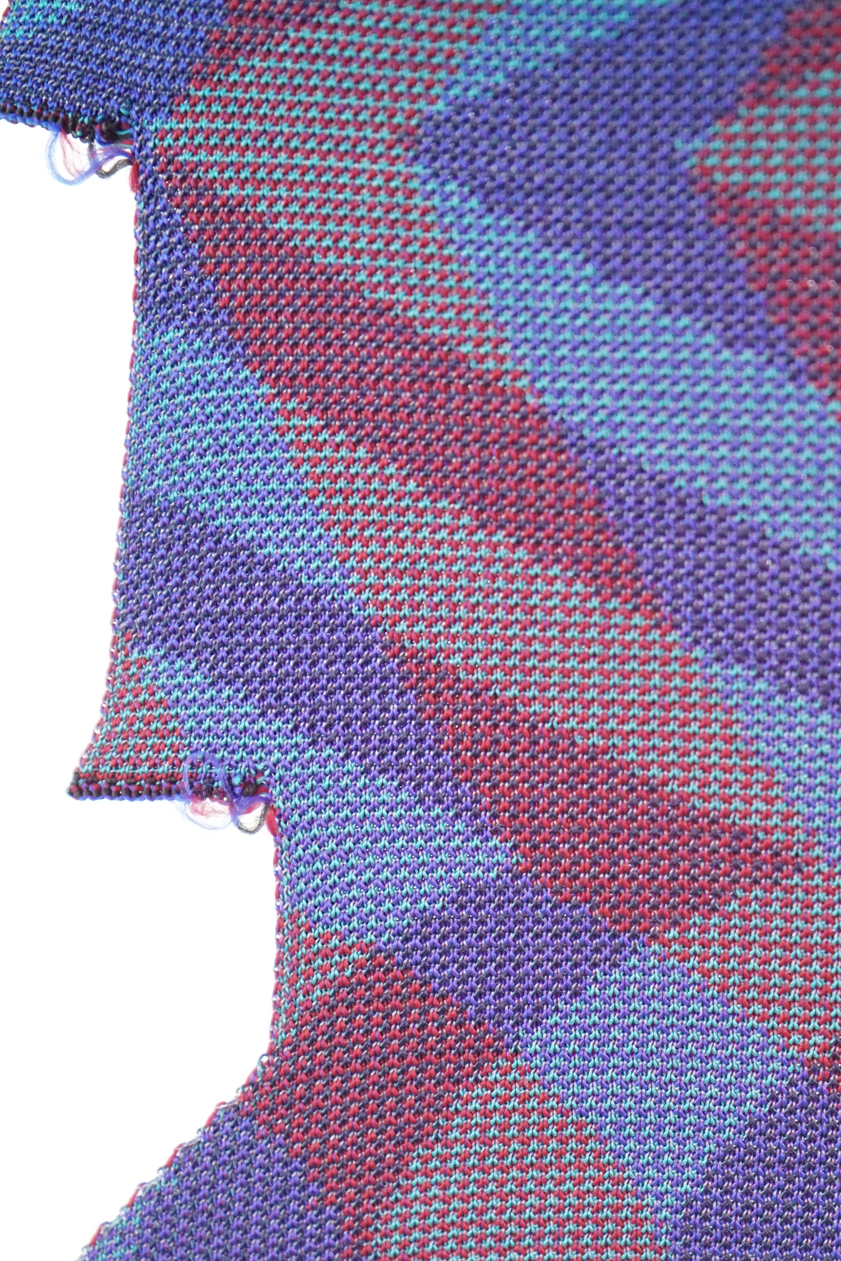 Shoe-upper with 4-colours featuring Stoll-ikat plating® with Mesh-structure. Shaping by cast-off technique.