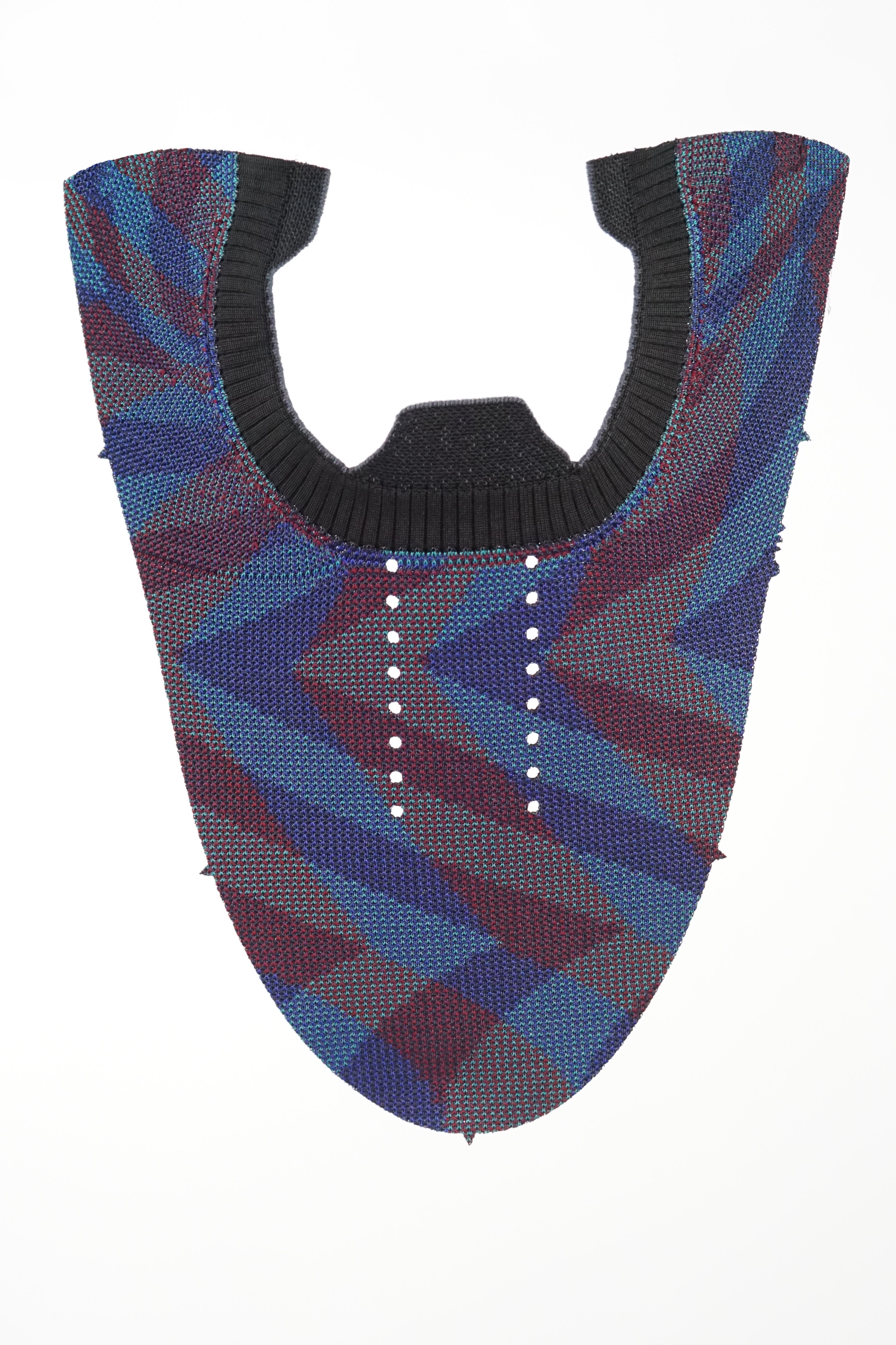 Schuh-Upper mit 4 Farben und Stoll-ikat plating® mit Mesh-Struktur. Formgebung durch Abketteltechnik.