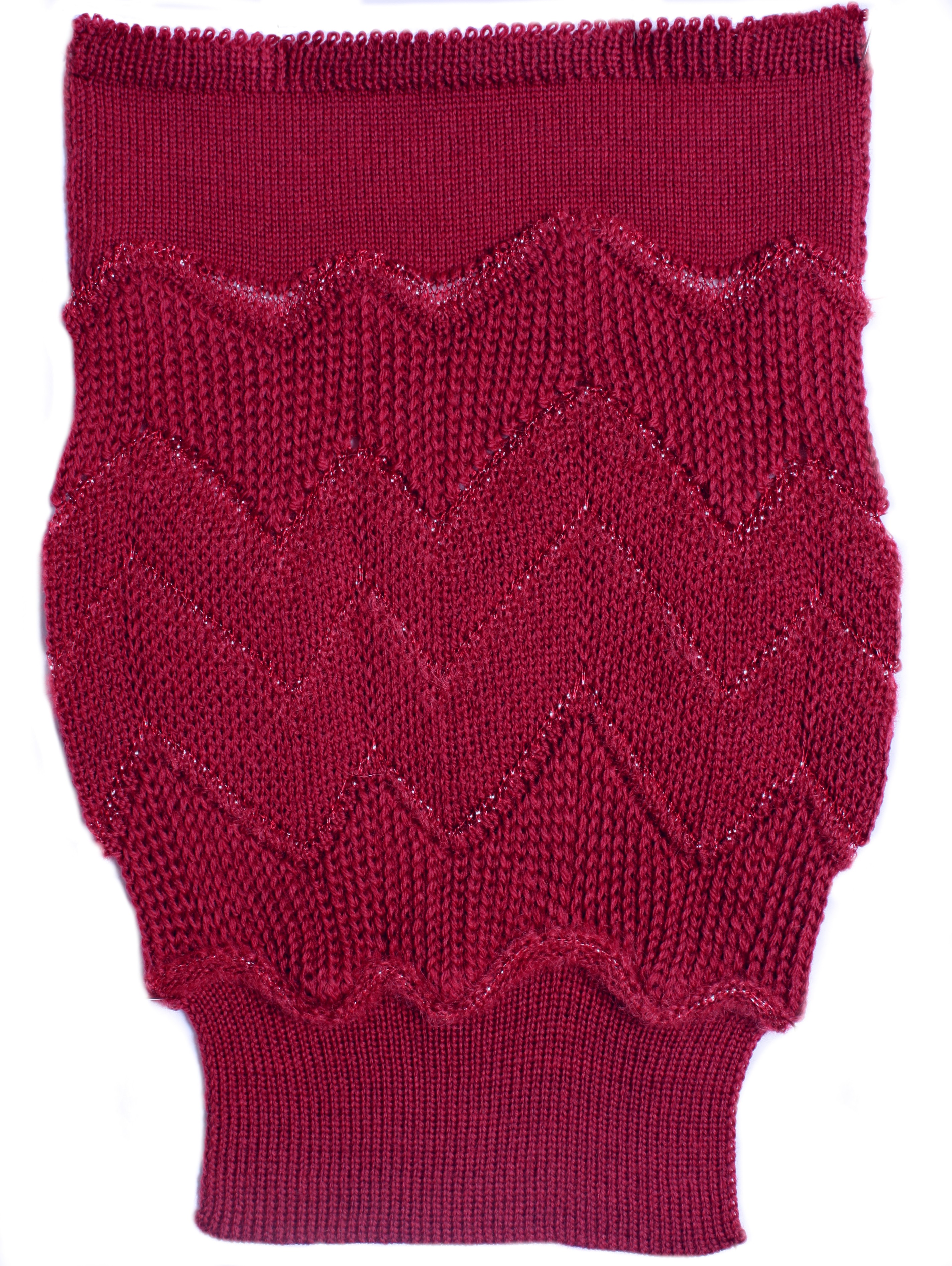 Musterausschnitt in Knieversatz-Musterung mit Garn- und Strukturringeln in 1x1 Rippe und allen Nadeln, ähnlich flexible gauge.