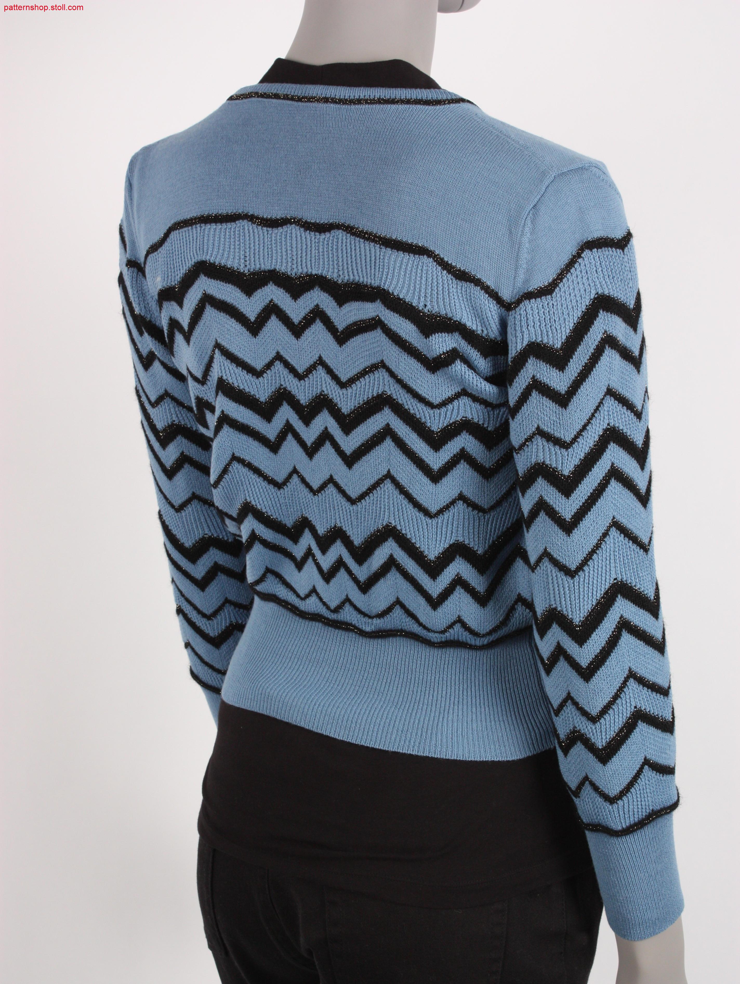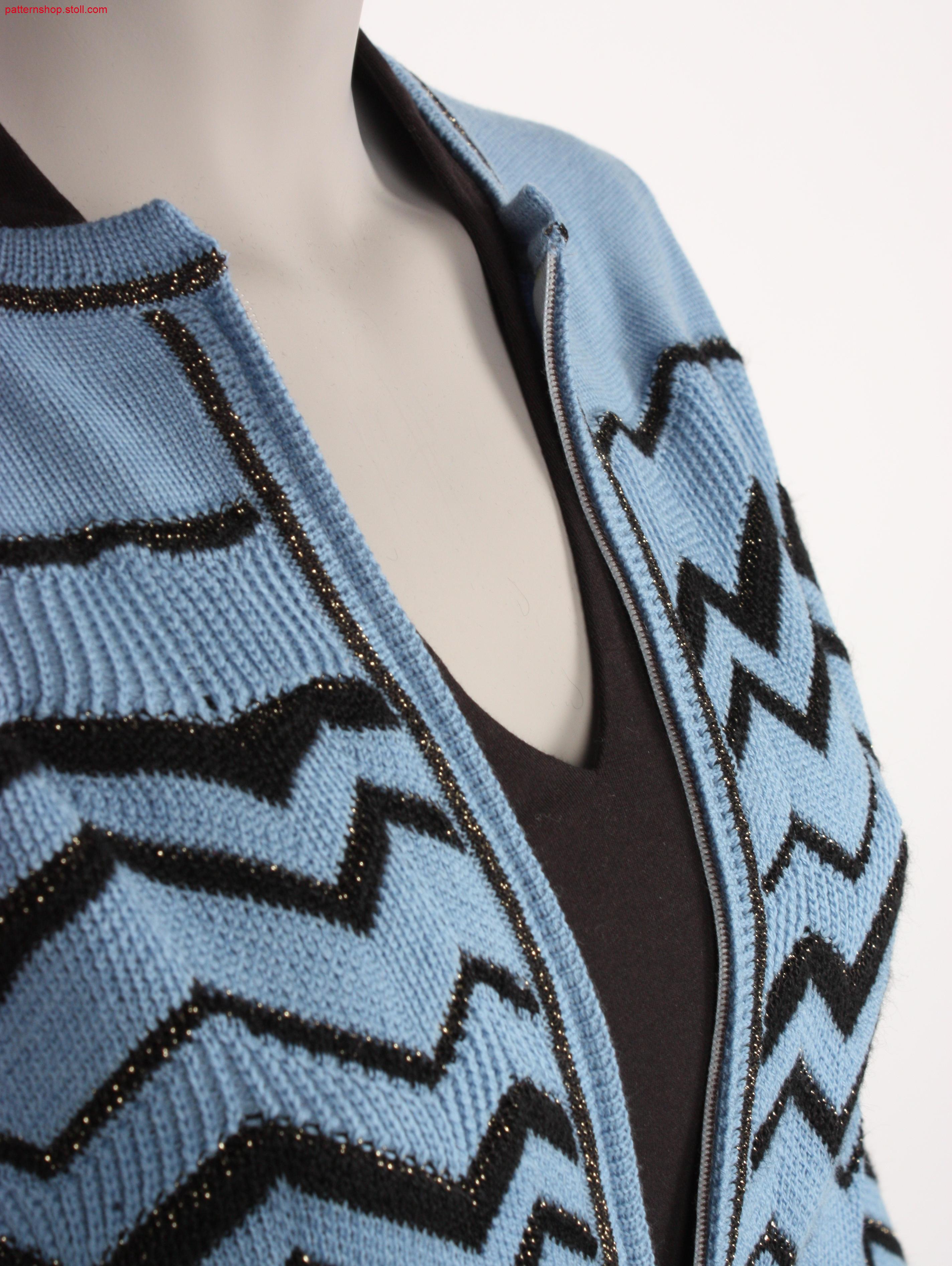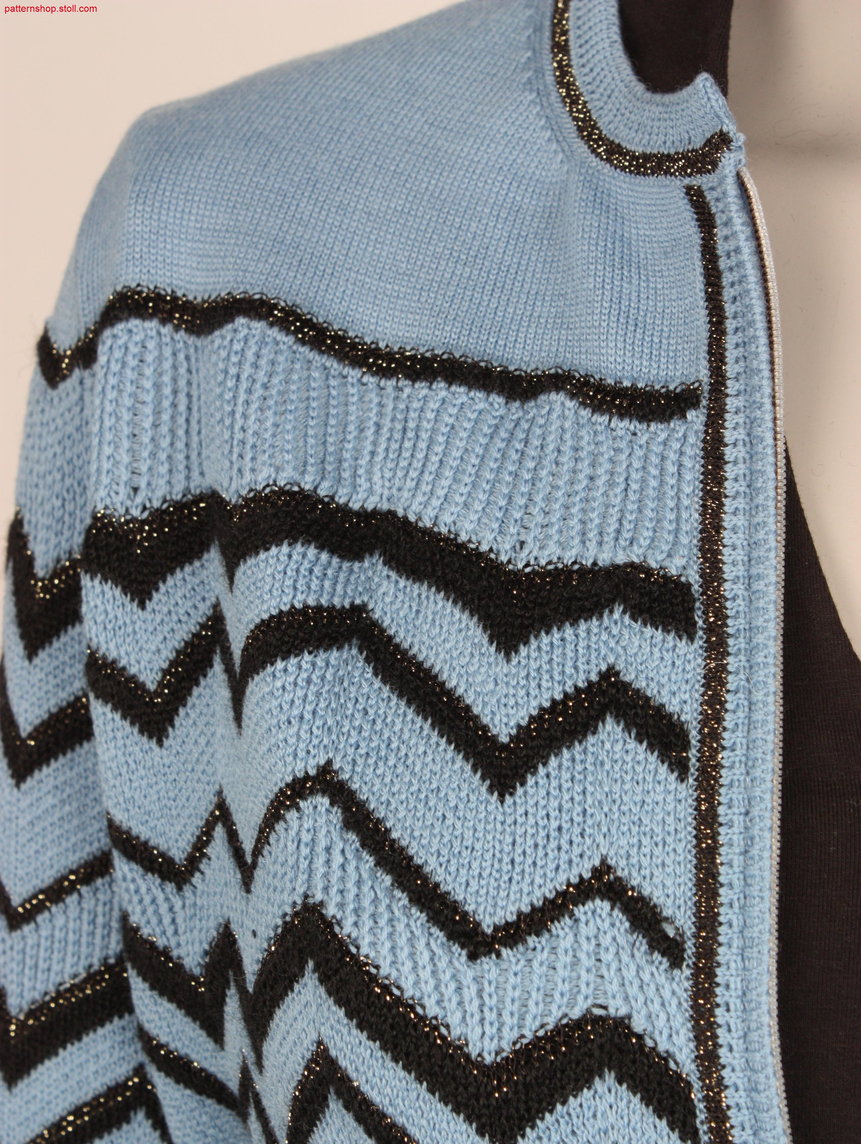 Fully Fashion cardigan with herringbone-racking design, yarn and structure stripes in 1x1 rib and all needles.